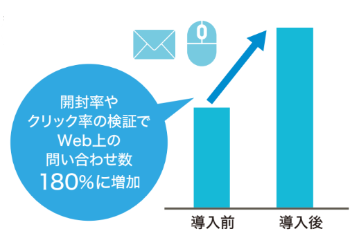各顧客リストに対するシナリオメールの構築、配信後の検証が可能となり、どのセミナーや商材の反応が良いかが可視化され、マーケティング活動への追加投資が容易になった。加えて開封率を上げるためのA/Bテストも開始した。導入前はHTMLメールを配信していたが、単純なテキスト風メールの方が顧客の反応が良いことがクリック率などからわかった。また、効果測定から、メールからWebサイトの導入例や製品ページへ来訪を促すことで、問い合わせや資料ダウンロードの件数が増加した。改善を繰り返した結果、開封率は20%から30%まで向上、問い合わせ数は前年比で180%となった。