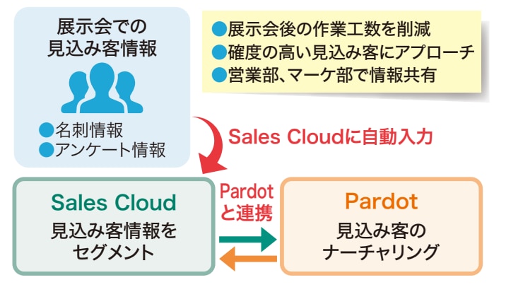 「自動化できることは極力自動で、人が介在せずに膨大な見込み客を振り分けられる状況を目指しました。また、営業が自分の案件をすべて追えなくても、一人ひとりのお客様には何らかのタッチができて、それが記録される仕組みを作りたいと考えました」(波多野氏)。展示会で得た名刺やアンケート情報は、すべてデジタル化して情報を紐付けたうえでSales Cloudに自動入力するサービスと連動。見込み客情報は、セグメントされてPardotに入る仕組みを構築し、アンケートデータが、営業とマーケティング部門の共有で使える情報に変わった。「一番の希望が実現できてホッとしました。また、展示会後の作業負荷が激減しました」(波多野氏)。膨大な見込み客情報のセグメントやスコアリングが可能になり、営業には確度の高い見込み客を渡すと同時に、Sales Cloudに案件を立てて、見込み客が放置されない仕組みもあわせて構築した。これにより、毎年出展している東京インターナショナル・ギフト・ショーからの契約件数は、前年度と比べて1.9倍と飛躍的に向上。数値としては見えていないが、販売機会ロスも減少している実感がある。