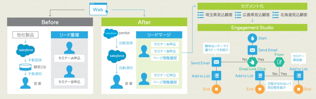 Webからの問合せから営業アサインまでを自動化し、顧客対応のスピード化 が可能になった。また、PardotのWebトラッキング機能を活用したことで、商 談の質が大幅に改善。