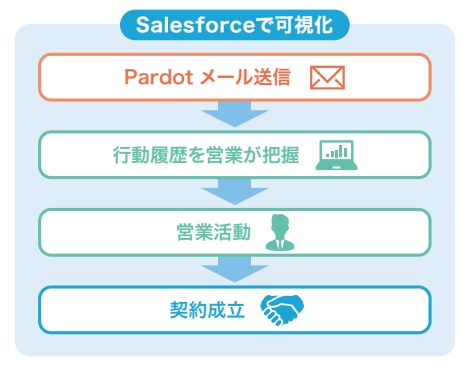 また、メールを開封した見込み客に対し、営業が電話などのアクションを行った際Salesforce上のレポートで可視化させるようにした。これにより、Pardotでのメール送信から、お客様の反応を見て営業活動をした結果、契約成立につながったという相関関係が実感できた。そしてPardotと現場との連携が大事だという認識が社内に広まり、Pardotから現場へのパスがうまく回りだした。