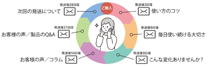 先端美容シリーズと位置づけ生命科学によりお客様の美容と健康に寄り添っている協和様が提供されている製品は、毎月続けていただくことで、美しさや健やかさが実感から確信に変わっていきます。長くお使いいただくために、便利でお得な定期便をおすすめしています。長くお使い頂けるように、定期便は通常価格よりお得に設定。お届けサイクルを選べたり、いつでもお休みできたり、お届け内容を変更できます。お試しいただいているお客様やご購入いただいたお客様へ、製品をお届けしたタイミングを起点に「ブランドの理念」「製品の内容や使い方のコツ」「継続的にご利用いただくことの大切さ」「継続利用で実感される変化の確認」「お客様の声」「一緒にご利用いただくことでより効果を高められる製品のご案内」などのコンテンツを定期的に配信することで、お客様により効果を実感していただきたいと考えています。