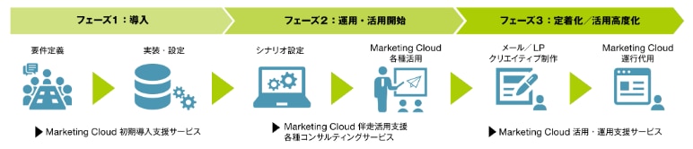 Salesforce Marketing Cloud は One to Oneカスタマージャーニーを実現するマーケティングプラットフォーム。顧客に適したメッセージを、適切なタイミング、様々なチャネルで届けます。toBeマーケティングのMarketing Cloud導入支援ではお客様の現在の業務や今後のマーケティング像に応じて、Marketing Cloud活用までの最適なロードマップをご提案。お客様に合わせて、導入から活用支援までトータルにサポートいたします。また、ローンチ後の運用支援や運用アウトソーシングサービスも提供しています。お客様の要望に応じて、導入支援だけでなく運用定着化、活用までをトータルでサポートします。