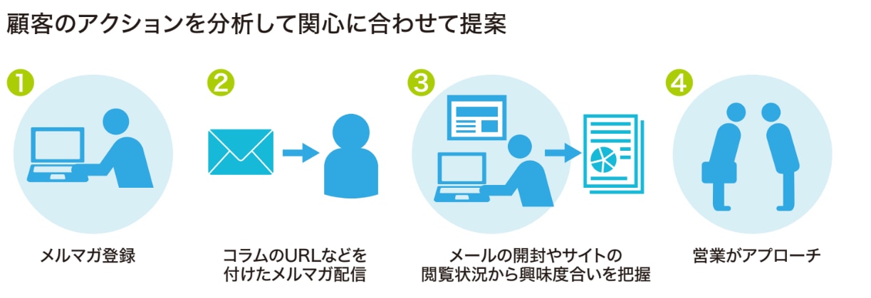 ではなく、メルマガの開封率やメルマガ文中のリンククリック率、サイトの閲覧状況などといった顧客の動向から、「どの顧客がどのサービスを求めているのか」というニーズを明確にした効果的なアプローチをしていくべきだと考えた。早くからITやWebでの施策を重視していたこともあり、同社はマーケティングオートメーション(=MA)ツールの導入を決めた。選定にあたっては5社の候補があったが、その中で既に顧客情報が入っているSalesforce CRMとの連携が可能であることから、Pardotの導入を決めた。また、MAの知識に長けている担当者もおらず、当時は操作画面が英語だったこともあり、手厚くサポートをしてもらえることも重要な要素だった。その点、PardotはtoBeマーケティングの伴走活用支援が受けられることも選択の理由となった。最初のうちは、多彩な機能を使いこなせずメルマガの配信に使うのがやっとだったが、手厚い支援によって、徐々に使いこなせるようになっていった。