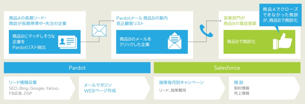 PardotとSalesforceを連携させ、見込顧客リストと契約・売上情報に紐づけることで、売上ベースの各施策の費用対効果を可視化。マーケティングのスピーディーなPDCAサイクルを実現した。