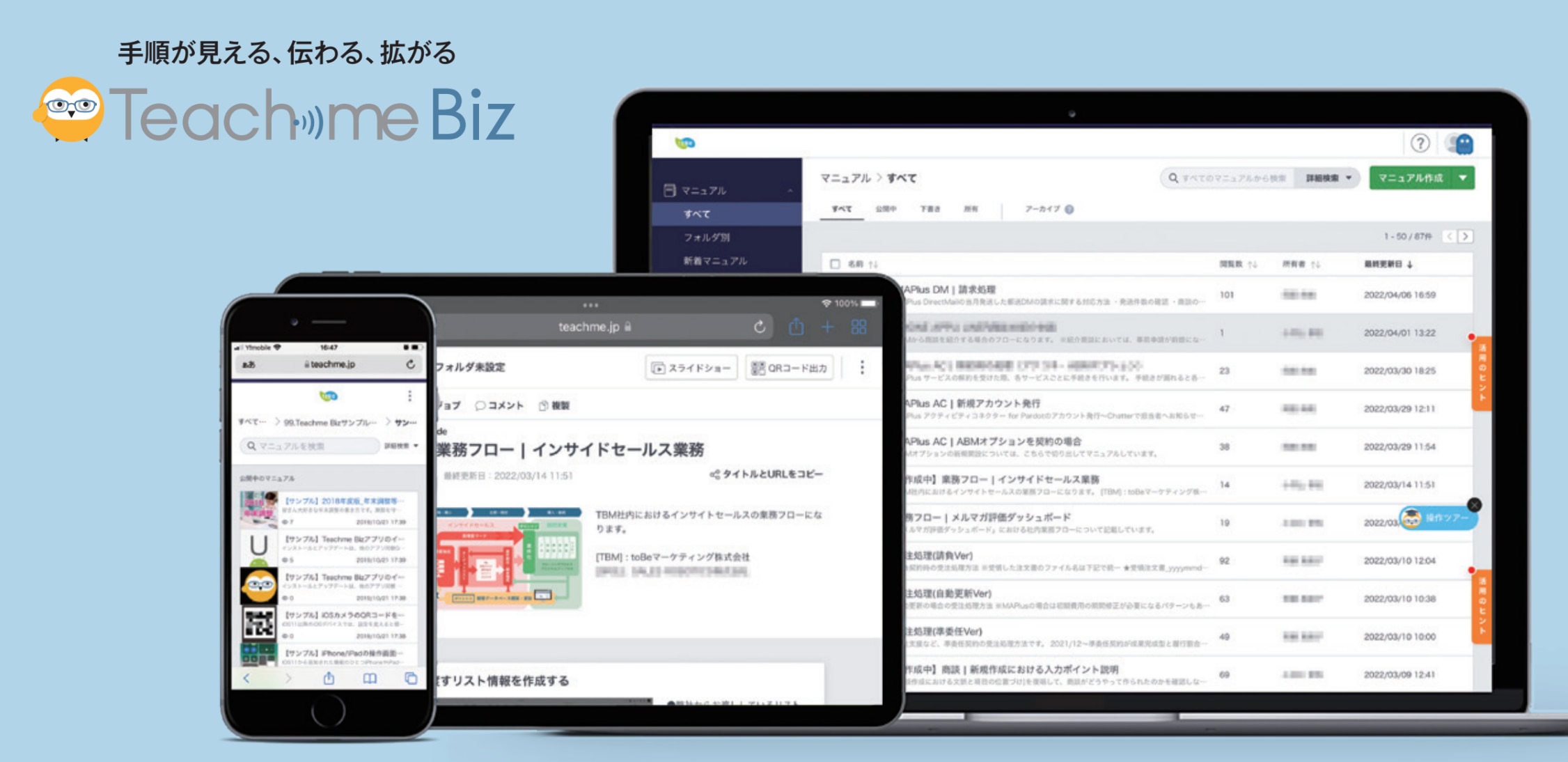 「伝えることを、もっと簡単に。」というミッションを掲げ、B to B向けのクラウド型のマニュアル作成・共有システム「Teachme Biz(テ ィー チミー・ビズ)」および、販促実行管理・支援システム「Hansoku Cloud」の開発、販売を行っている。企業内で日々発生する「手順や方法の伝達ロス」を減らして、業務の生産性向上に貢献することをめざす。