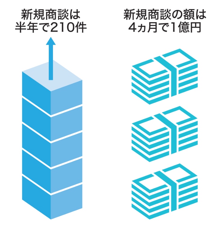 アプローチしたい見込み顧客をターゲットアカウントと定義し、ターゲットアカウントに対して、これまでにどれだけの活動を行い、どこまで入り込んでいるのかを“見える化”。取引先の登録状況とカバレッジがわかり「インサイドセールスグループが案件化すべきリード」「担当営業がフォローすべき既存顧客」という住み分けが明確化した。営業担当は今月の数字、前月の数字、今売り上げになりそうな顧客にフォーカスを当てがちだが、インサイドセールスグループが案件化した「確度の高い見込み顧客」に対する営業活動が行えるようになった。インサイドセールスが効率的に見込み顧客を案件化できるようになった結果、部門立ち上げから半年で210件の新規商談が生まれ、“顧客情報の名寄せ”が完了してから4ヵ月で、新規商談の額は約1億円という規模を実現した。
