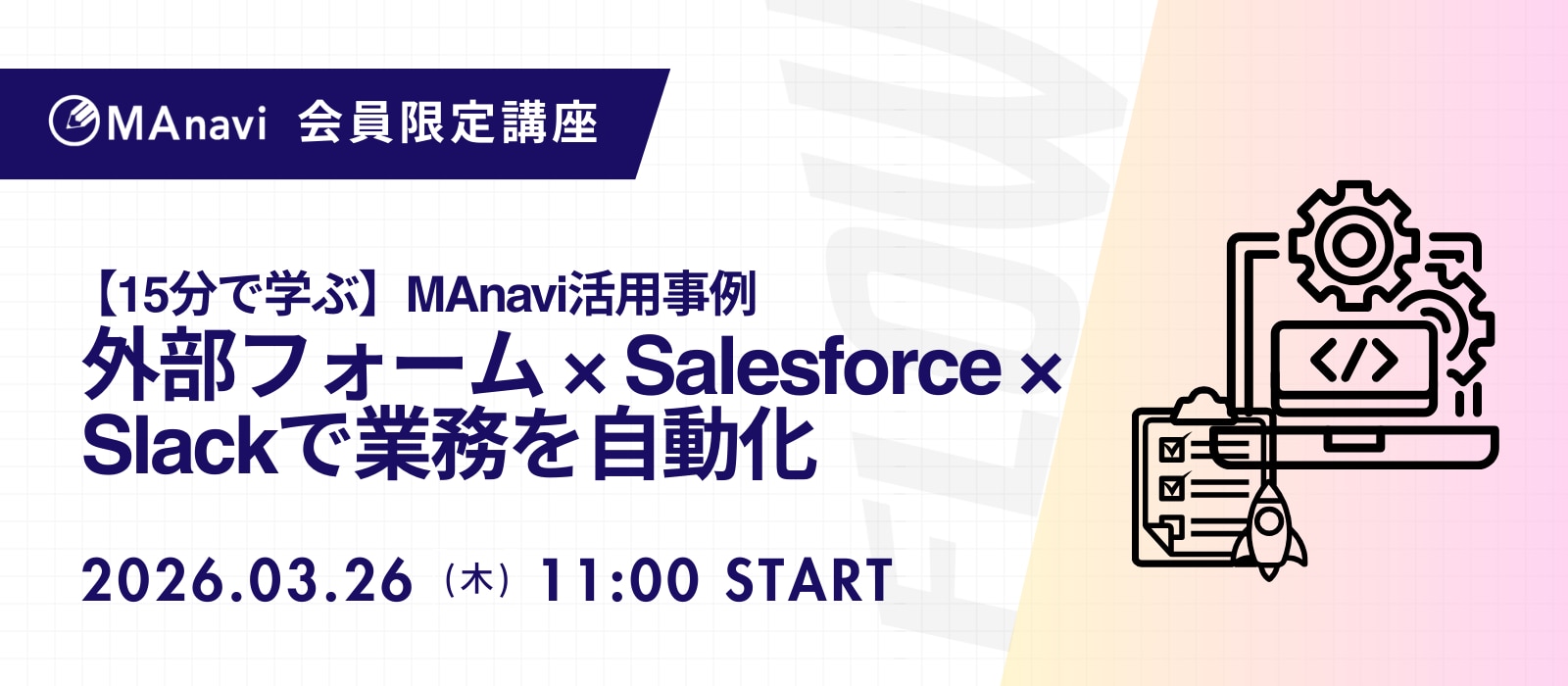 タイトル | MAnavi講座 | 【15分で学ぶ】MAnavi活用事例:外部フォーム × Salesforce × Slackで業務を自動化 |