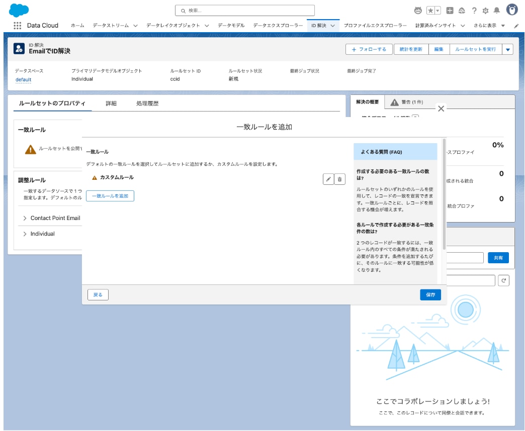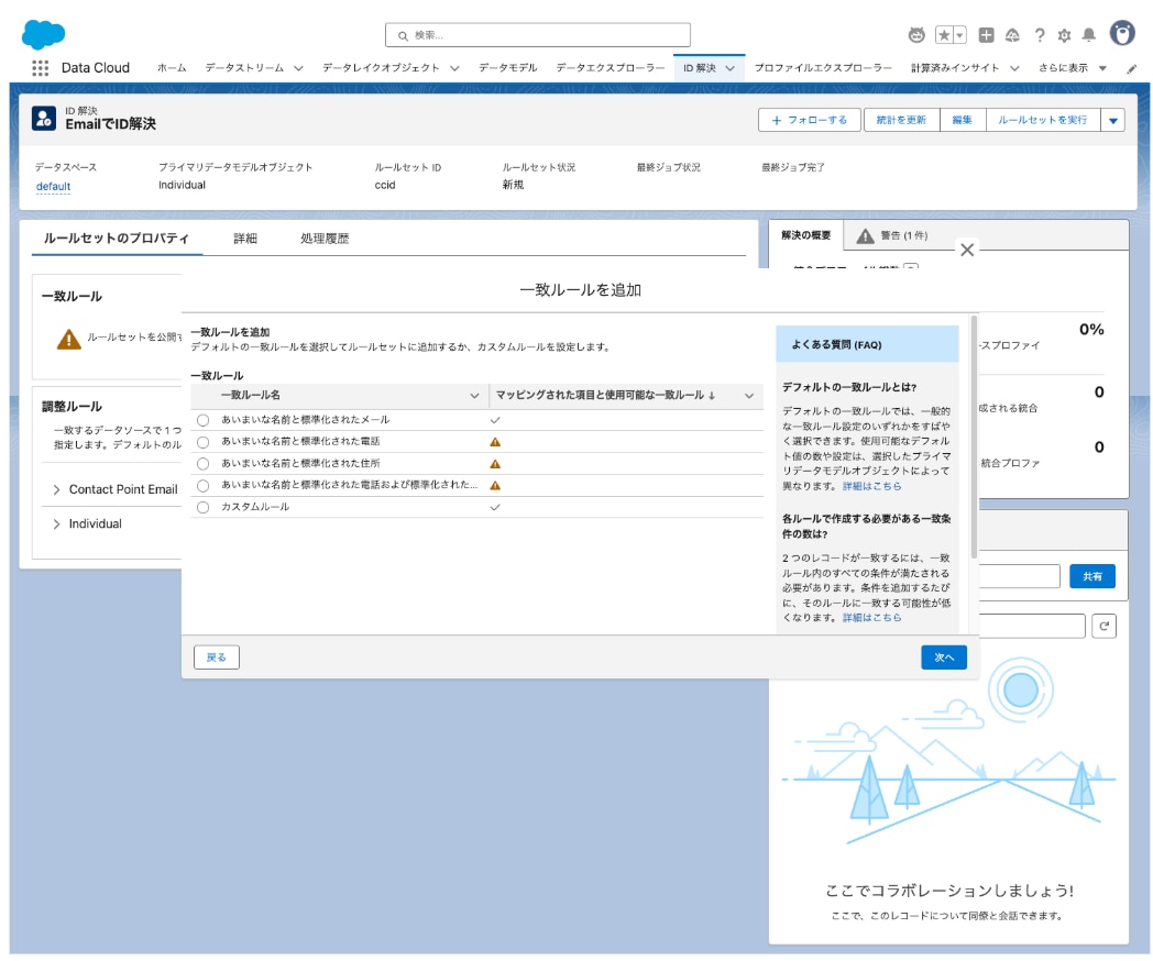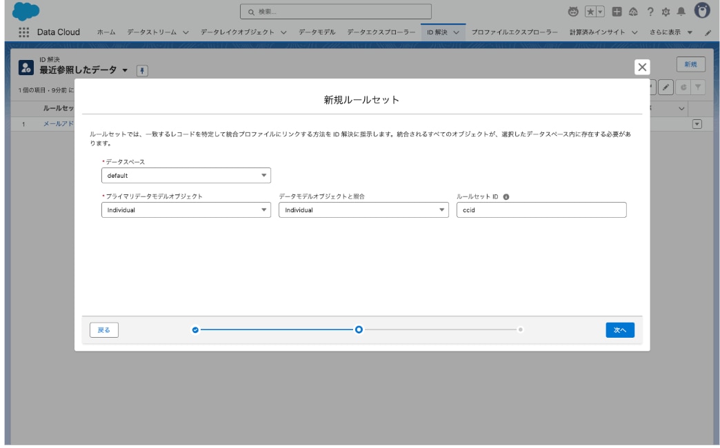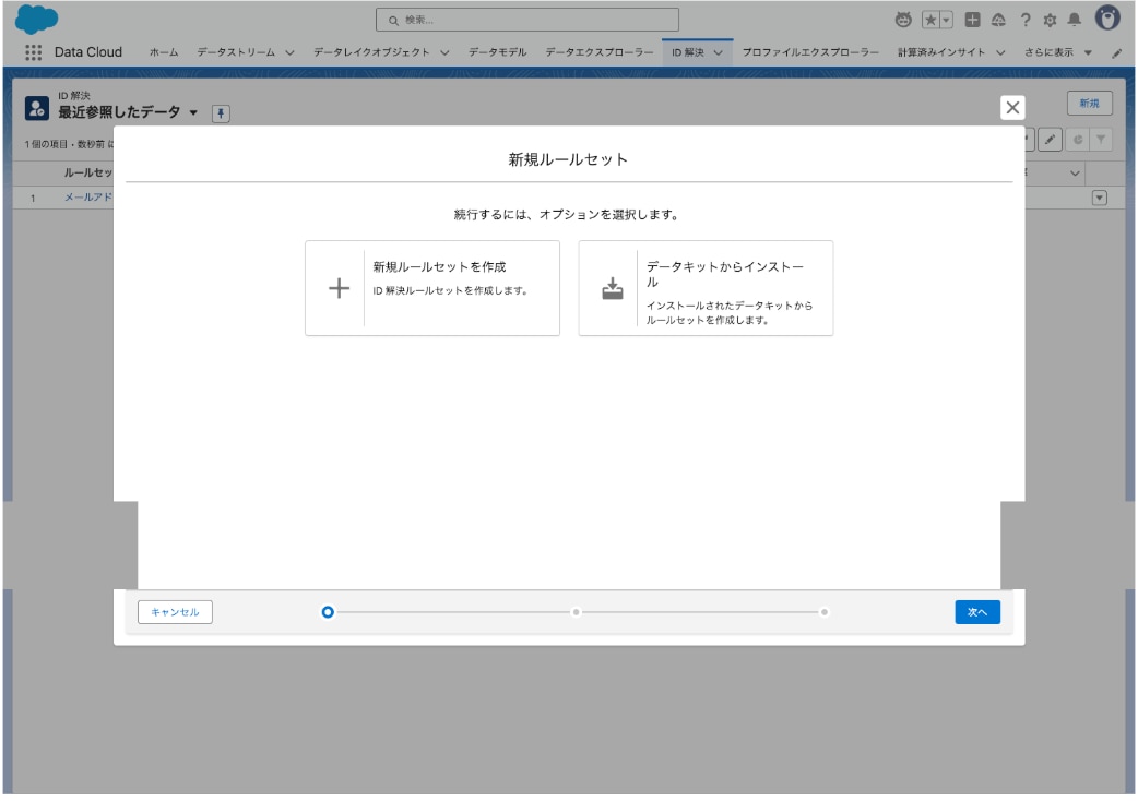 DataCloudにログイン>[ID解決]>[新規ルールセットを作成]>[次へ]