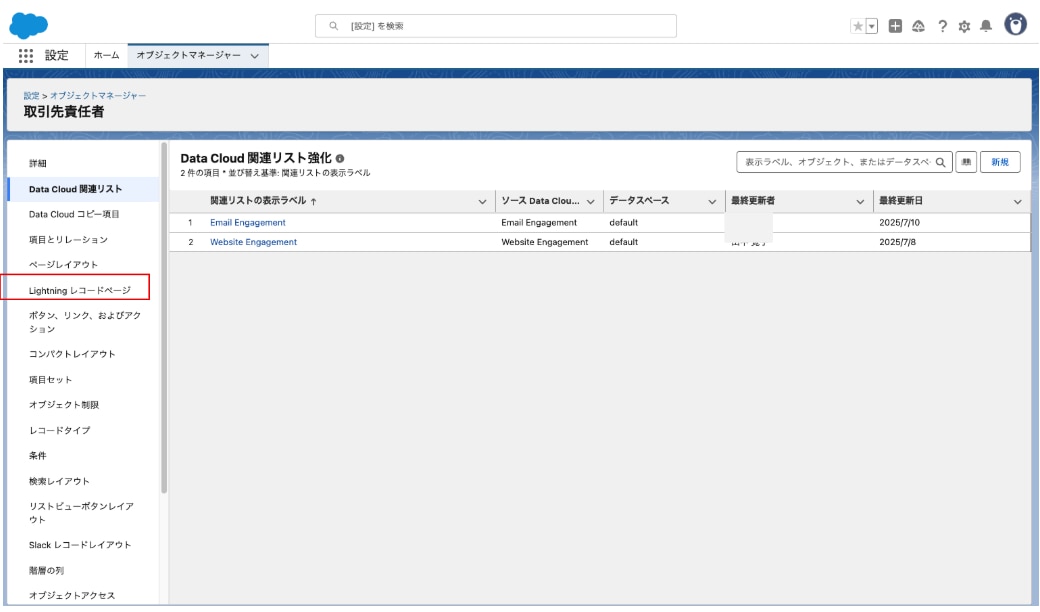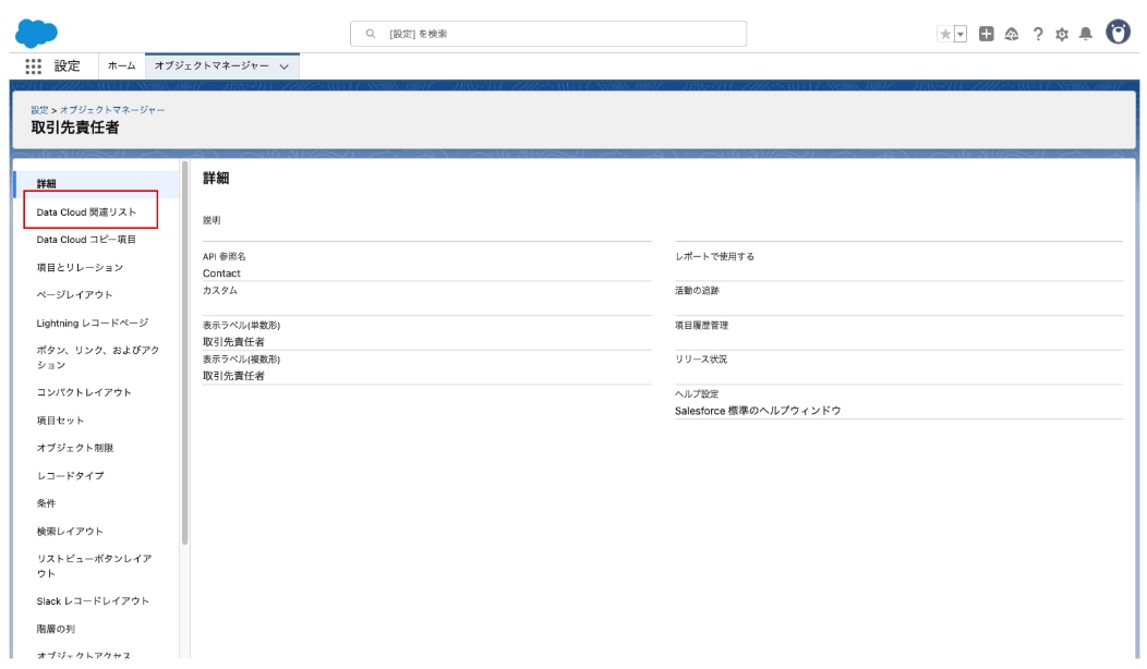 [設定]>[オブジェクトマネージャ]>[取引先責任者]>[Data Cloud関連リスト]をクリックします。