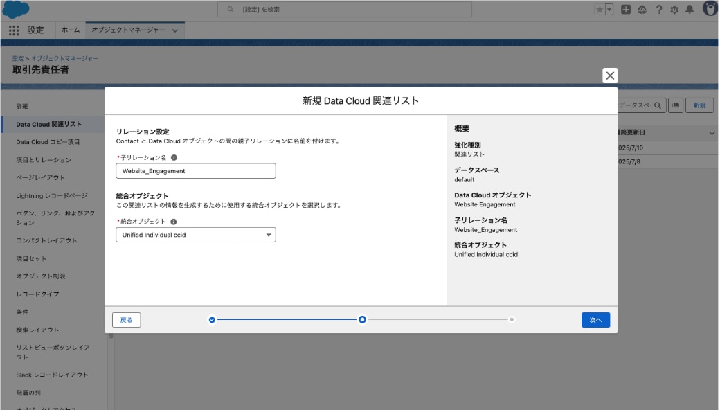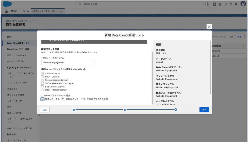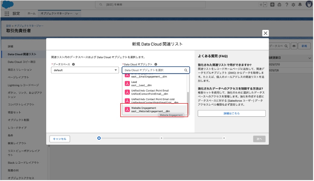 (ワンポイント)動的関連リストを作りたいのだから「Data Cloud関連リスト」の作成は不要では?と思っていたのですが、「Data Cloud関連リスト」を作成せずに動的関連リストを作成したら、動的関連リストの作成時に「Website Engagement」がリストに表示されませんでしたのでご注意を。