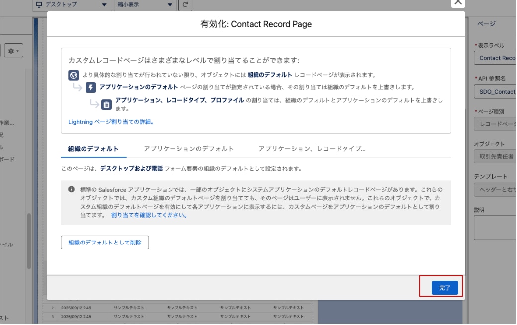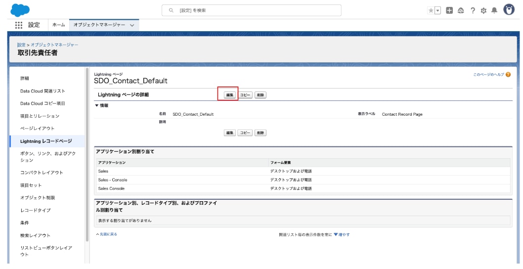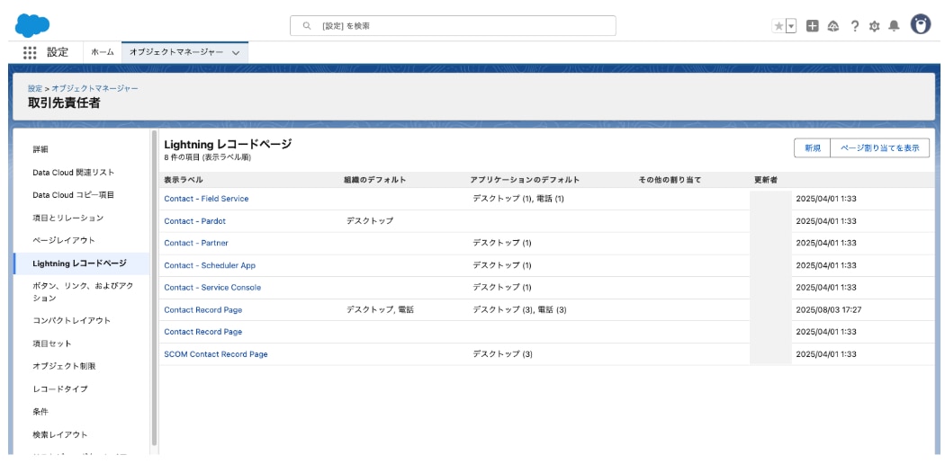 [設定]>[オブジェクトマネージャ]>[取引先責任者]>[ Lightning レコードページ]をクリックします。