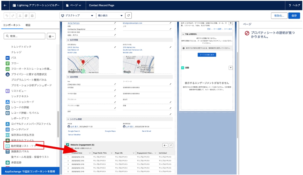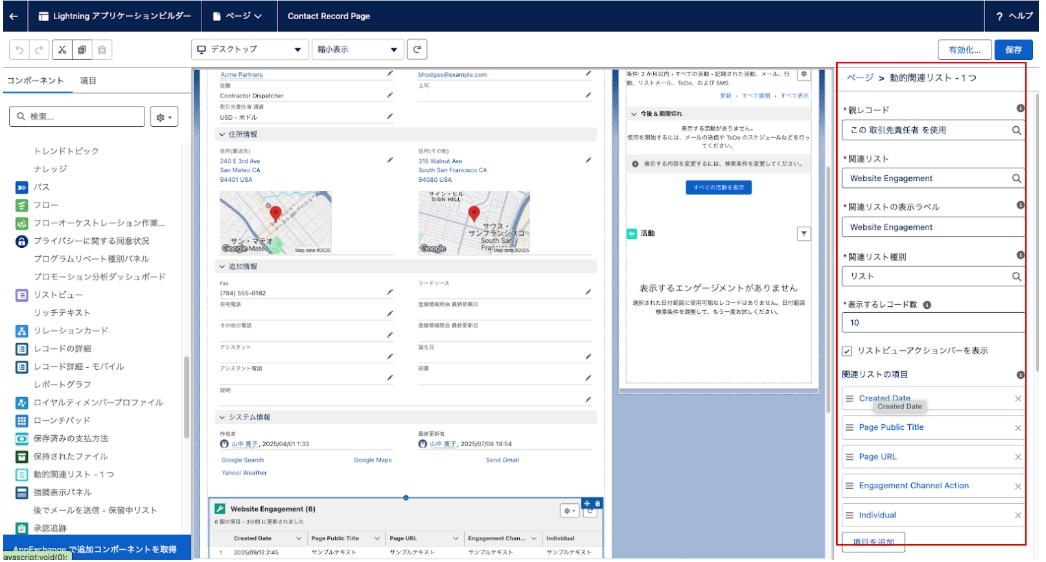 追加したコンポーネントをクリックすると、右側のサイドバーで動的関連リストの詳細が設定できるようになります。