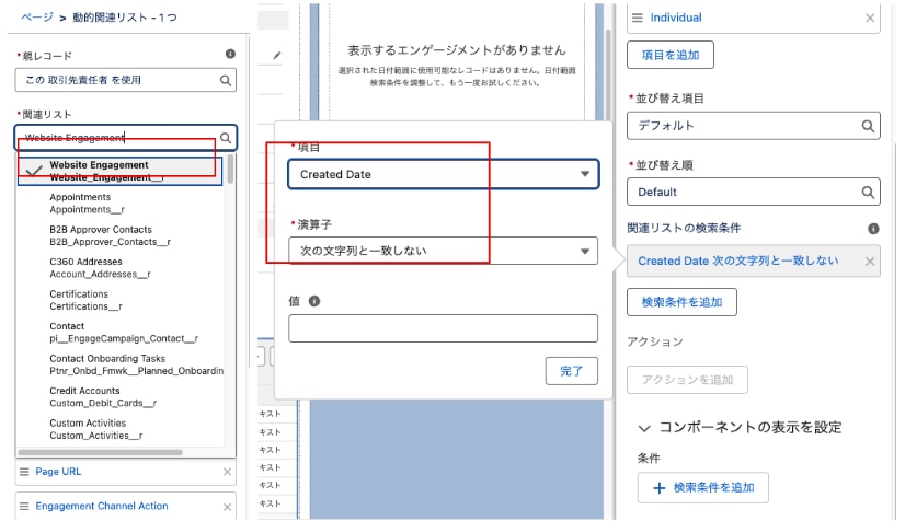 関連リストの検索条件:項目を「Create Date」演算子「次の文字列と一致しない」値「<空白のまま>」にして[完了]をクリック。
