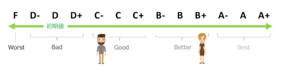 • グレード: 全体でFからA+までの13段階のグレードが用意されています。判定基準となる条件項目に合致するほど、グレードは高くなります。