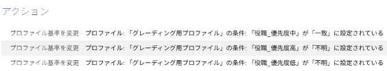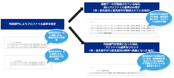また、所属部署の優先度が変更となった場合に備え、「プロファイル基準のリセットとタグの削除を行う」ルールの追加も行います。これにより、常に最も優先度の高い評価のみが残ります。