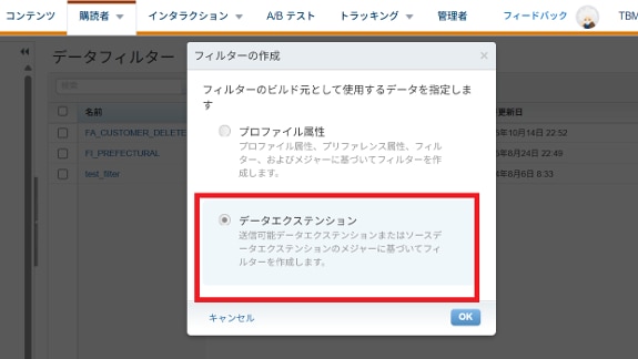 今回は手動で作成するため、上記画面で「データエクステンションの作成」をクリックします。