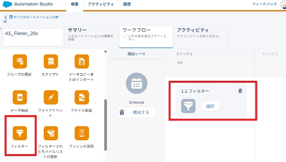 フィルターアクティビティの「選択」をクリックし、「新しいフィルターアクティビティの作成」をクリックします。