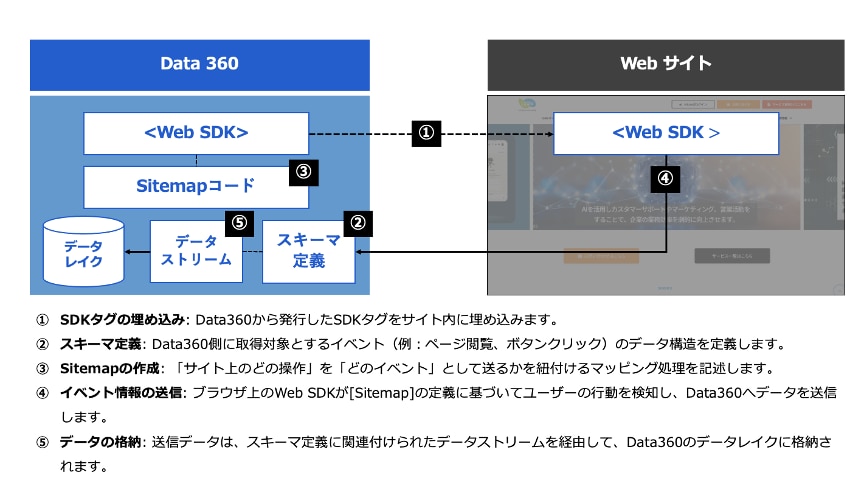 ①SDKタグの埋め込みは、Data Cloud(Data360)から発行したタグ1行をサイトに埋め込むだけです。④イベント送信/⑤データ格納はWeb SDK/Data 360が自動でおこなってくれます。