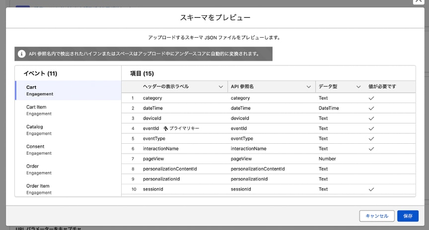 本ブログでは、説明のためSalesforceの推奨スキーマに、以下のスキーマを追加します。(User Engagementというスキーマ)