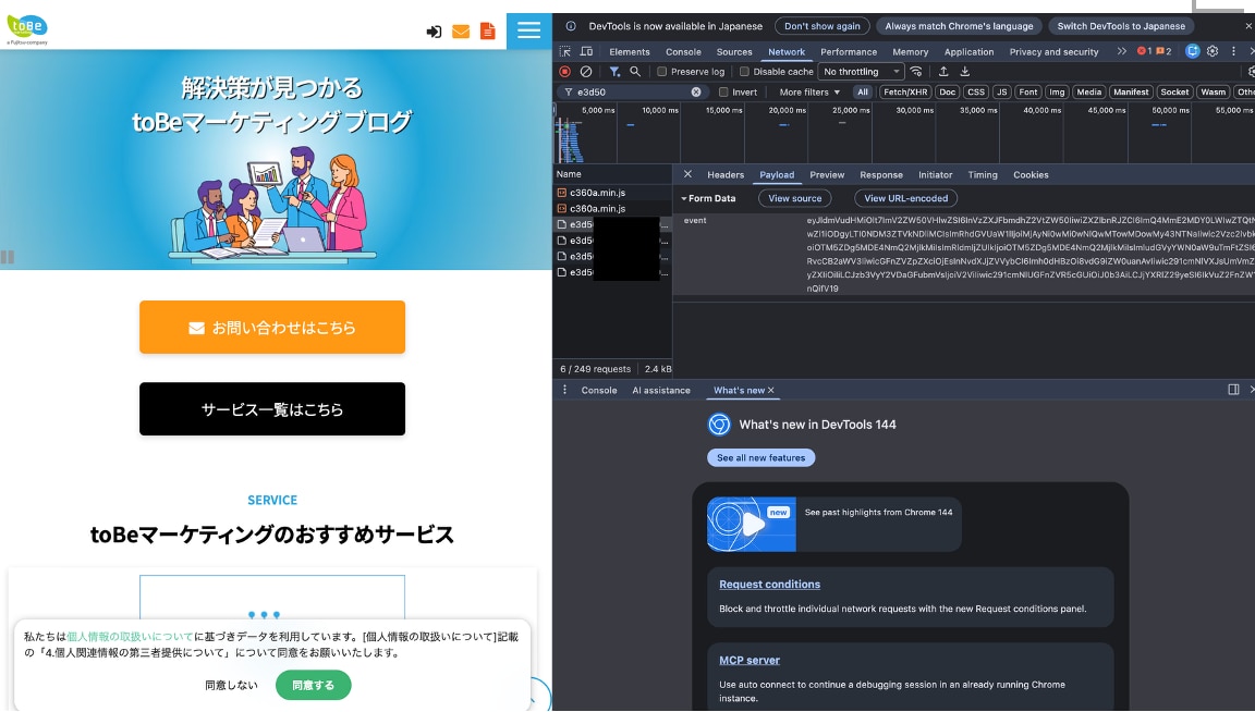ネットワークを確認してWeb SDK からデータがPOSTされていれば送信成功です。