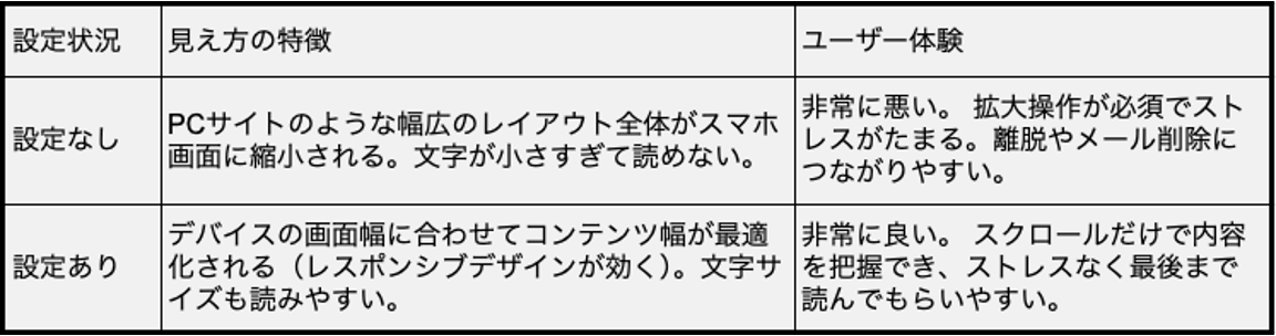 設定がない場合、スマホはメールを広い仮想画面幅(例: 980px)でレンダリングし、それを強制的にデバイスサイズに縮小します。これが「PC版のレイアウトが豆粒のように縮小される」現象の正体です。文字が小さすぎ、リンクがタップしにくいという問題が発生します。