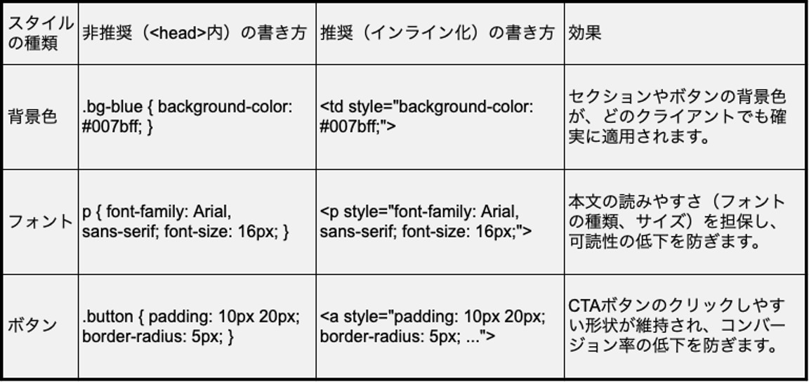 メールのデザイン、特に レイアウトや色に関する指定は、<body>内のHTML要素に属性として直接記述(インライン化)することが強く推奨されます。
