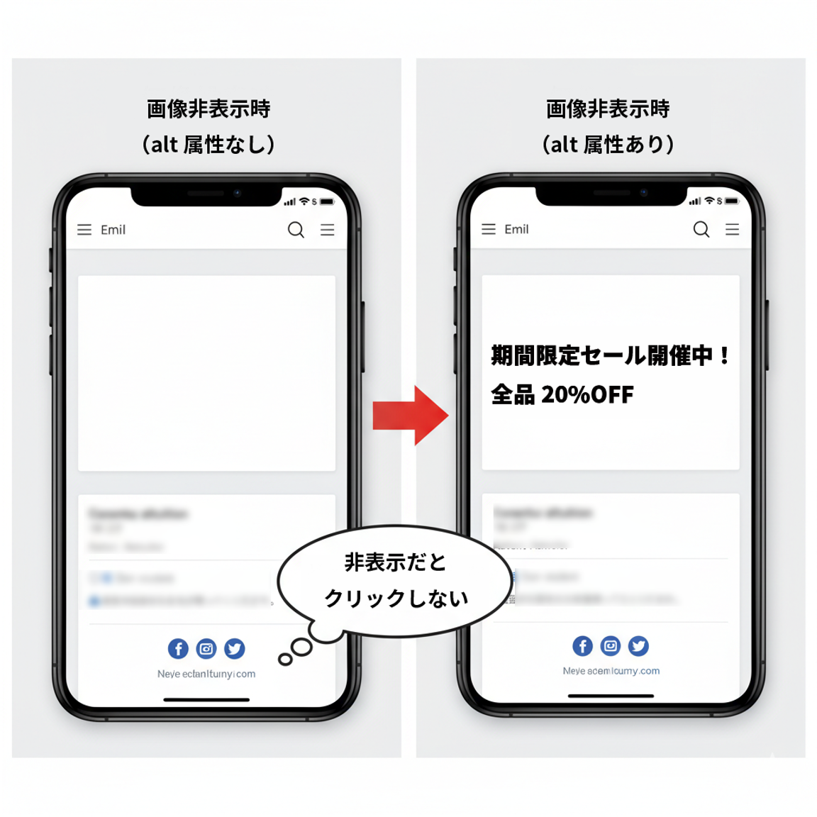 alt属性がないと、画像が表示されない場合にただの空白になってしまい、メールの内容が伝わりにくくなります。