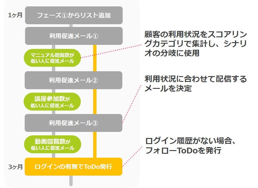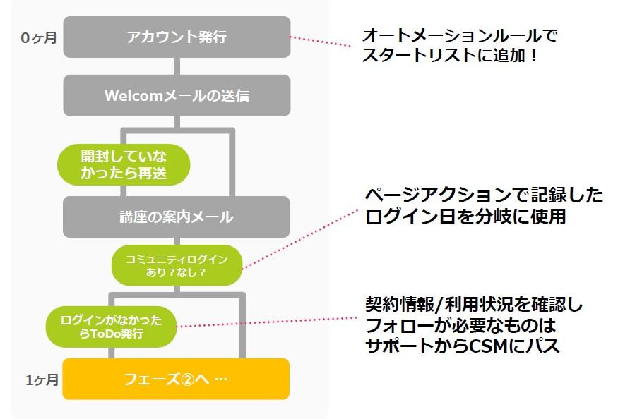 アカウント発行後~1ヵ月をフェーズ1として、まずはログインして活用してもらうためのシナリオを作成します。