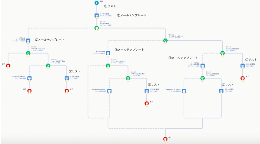 次に、対象者へメール送信を行い、「開封するかしないか」「リンククリックするかしないか」でそれぞれ分岐させます。この "リンク" というのがPardotフォームになっており、直接お申し込みができるフォームとなります。開始地点が資料ダウンロード者対象でなければ、こちらのフォームを資料ダウンロードフォームとして活用でも可です。フォーム通過者に関しては、リストに追加しておき、別シナリオでお礼メールや担当者からご連絡をします。