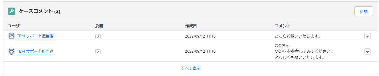 ケースコメントを使うことで、1つのケースに対して「誰が」「いつ」「何の」コメントのやり取りをしているのかを一目で確認できるのがメリットです。
