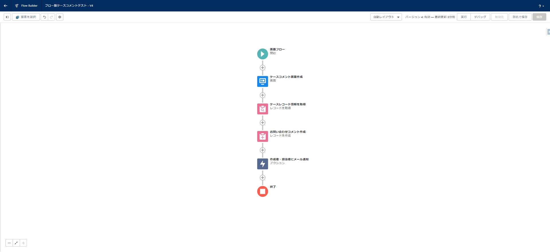 挙動としては画面フローで作成したコメント欄に入力すると、「お問い合わせコメント」にコメントの履歴が残り