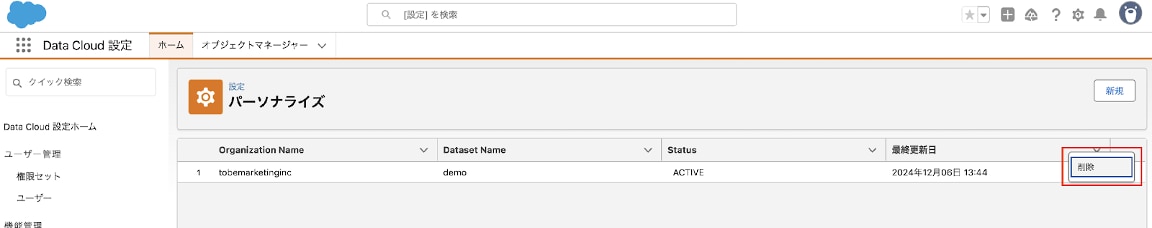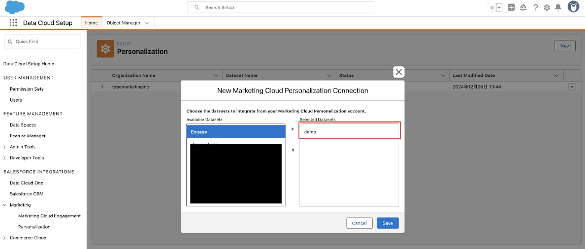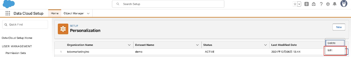 接続用ユーザの作成が完了したらData CloudとPersonalizationを接続します。