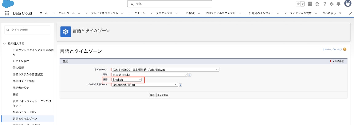 2-9. 画面右上の自身のアイコンを選択して「設定」をクリックします。私の個人情報>言語とタイムゾーンから言語を「English」に選択して保存します。
