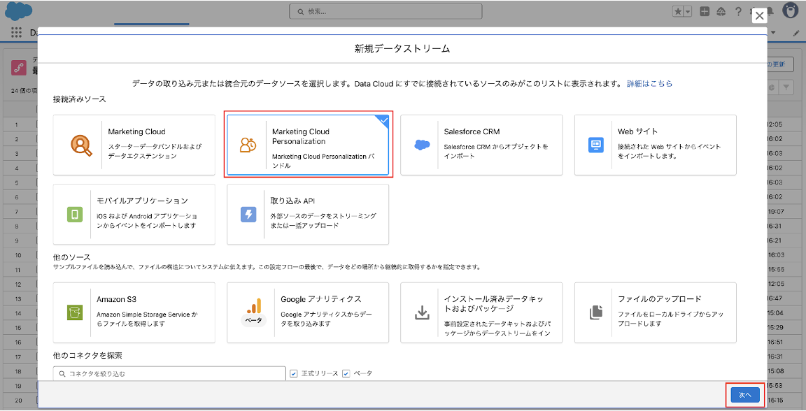 3-2. データストリームの管理画面から「新規」をクリックし、接続済みソースから「Marketing Cloud Personalization」を選択して「次へ」をクリックします。