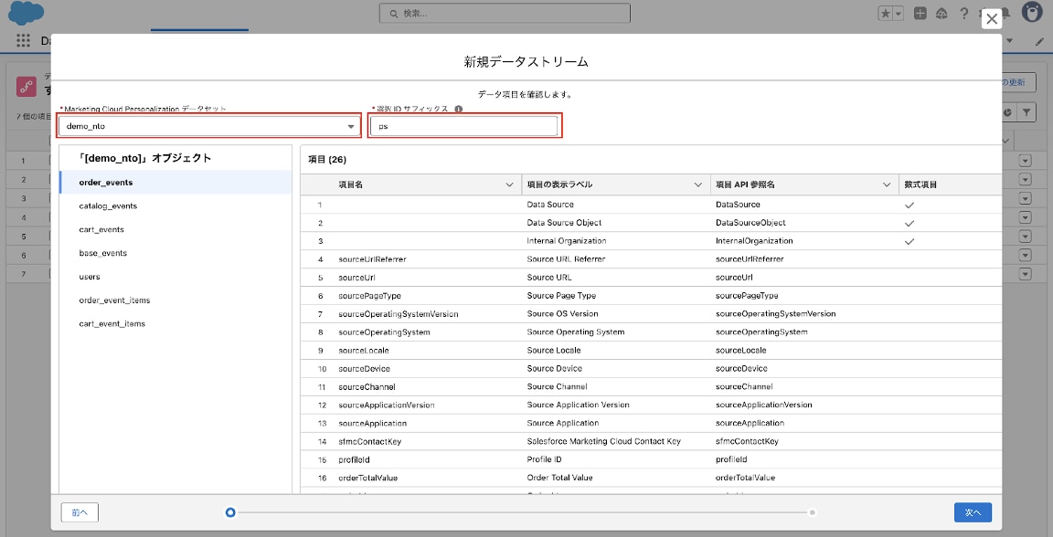 3-3. 「Marketing Cloud Personalization データセット」に取り込み対象のデータセットを選択、「選択 ID サフィックス」に任意の文字列を入力して「次へ」をクリックします。