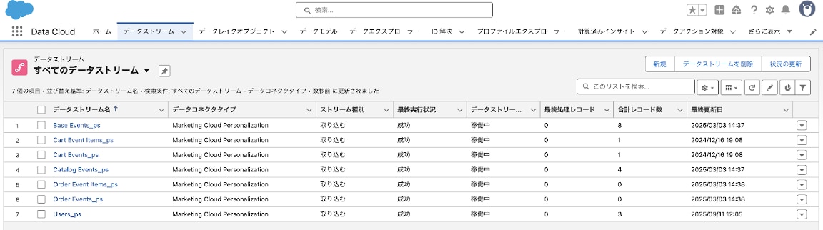 3-5. データストリームの一覧にPersonalizationから連携されるデータストリームが7つ作成されます。