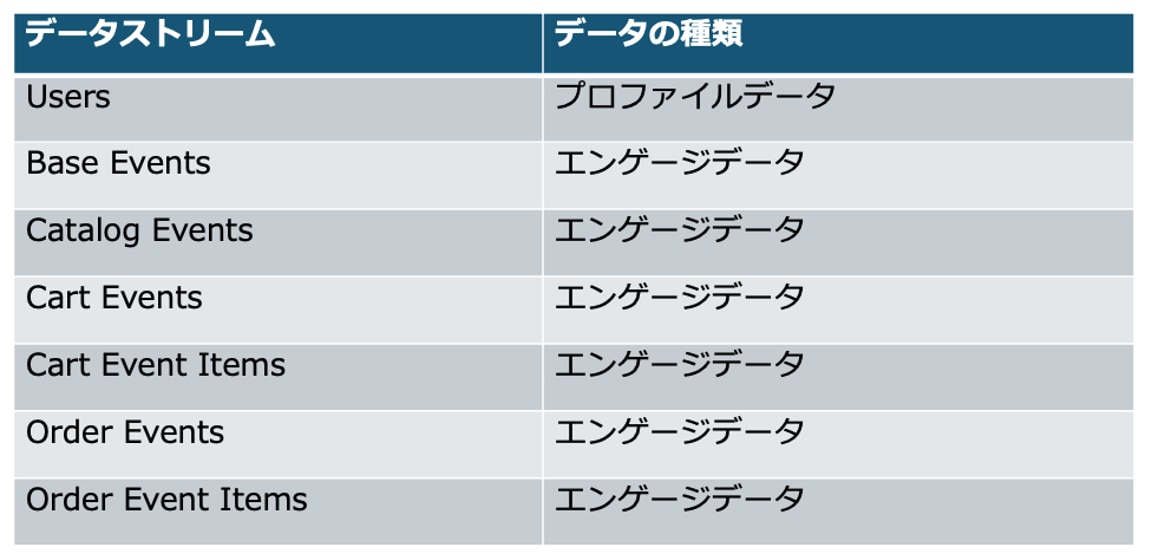 7つのデータストリームは大きく2種類に分かれており、プロファイルデータとエンゲージデータとなります。プロファイルデータはその名の通り顧客データで、エンゲージデータは行動データという種類を表しています。