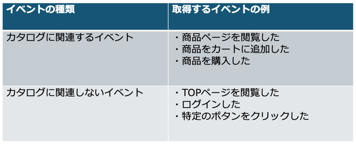 つまり、商品に関連するイベントと商品に関連しないイベントの大きく2つに分かれるということです。では、それぞれのイベントで取得されるイベントの例を見てみましょう。
