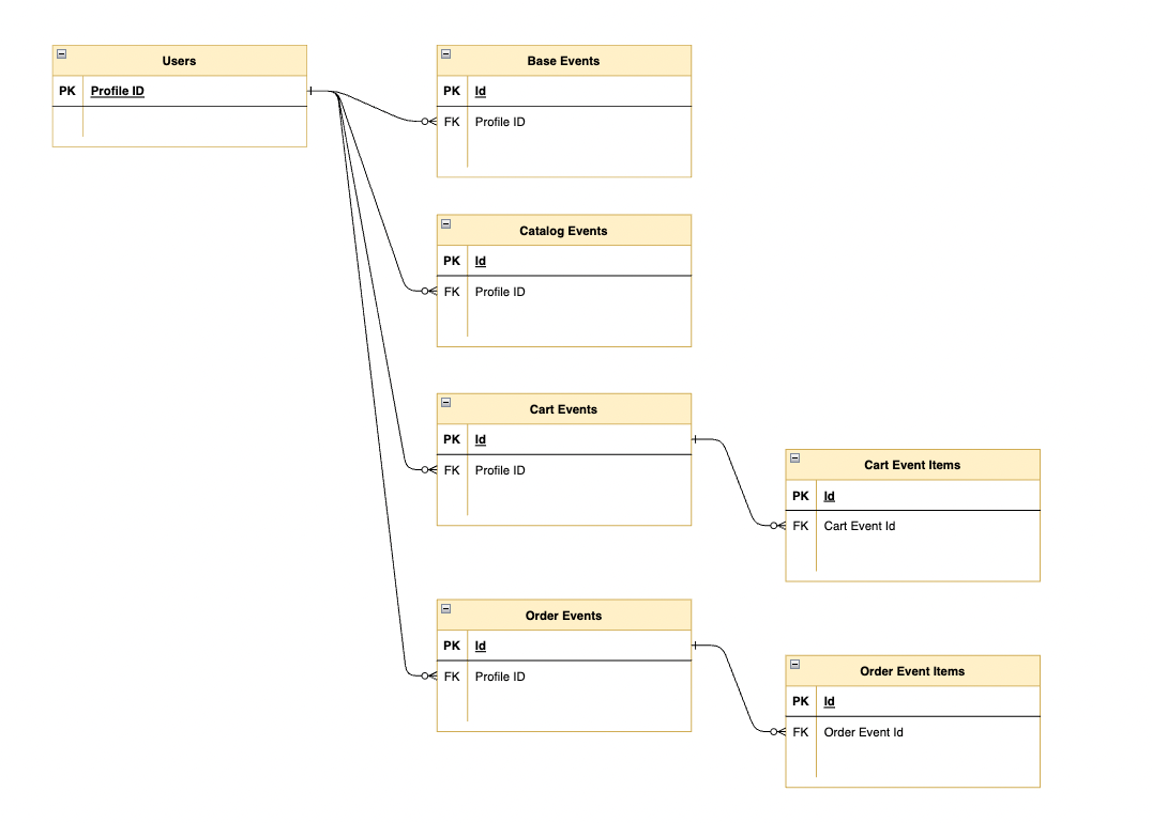 ※購入操作のイベントだけを格納するため、カタログ単位(どんな商品を購入したか)までは保持しません。カタログ単位のデータは後述するOrder Event Itemsにて保持します。