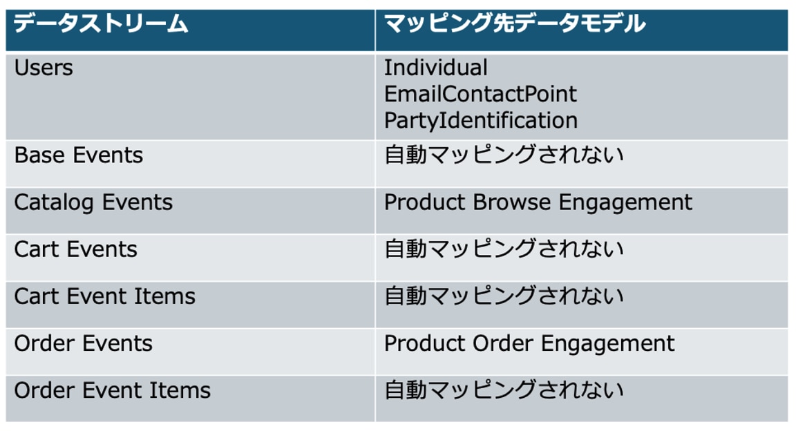 自動マッピングされない「Base Events」「Cart Events」「Cart Event Items」「Order Event Items」に関しては、手動でデータモデルへのマッピングを実施する必要があります。