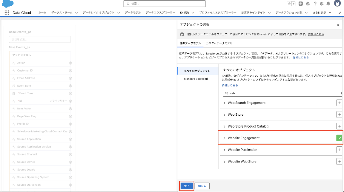 4-5. 推奨されるデータモデルを選択して、「完了」をクリックします。(※Base Eventsの場合、Website Engagement)