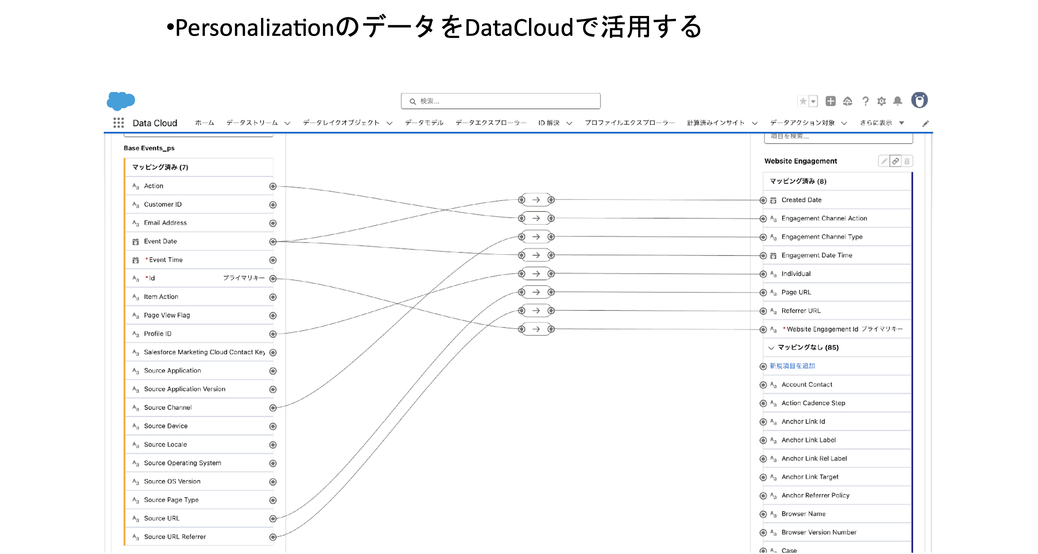 Personalizationから連携されるデータの理解ができたところで、データモデルへマッピング設定をしていきます。