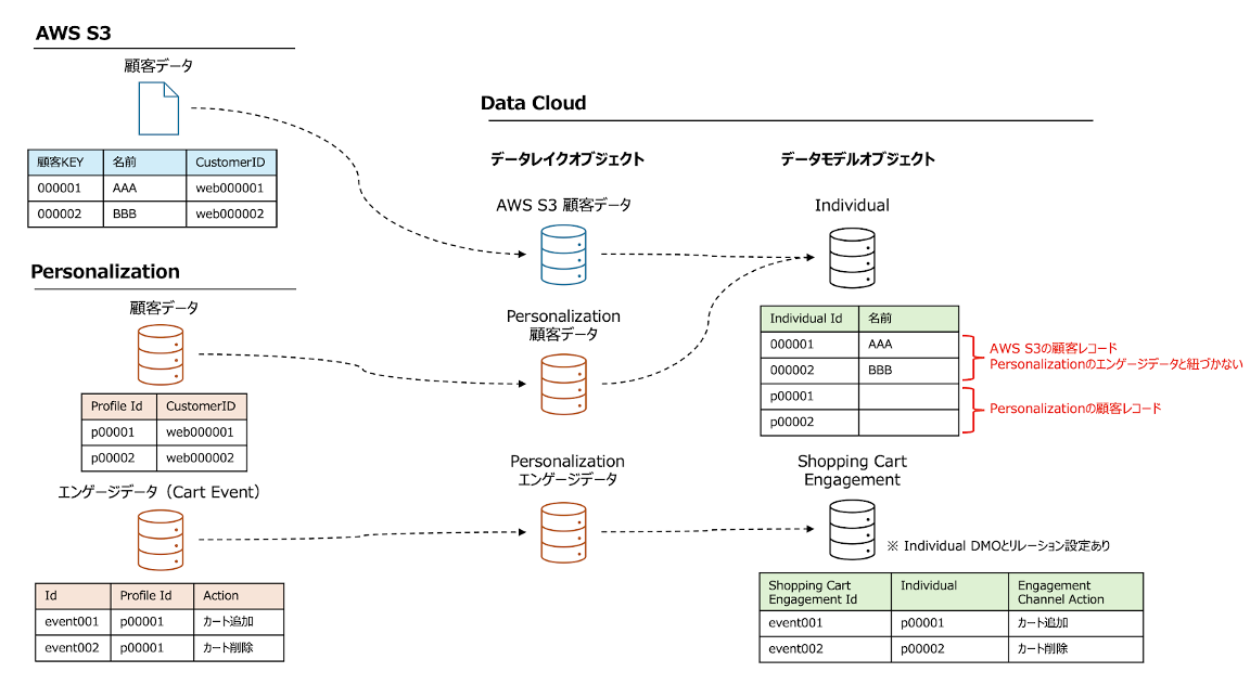 下記の例のように、外部データソースとしてAWS S3から顧客データを連携していると仮定した場合、Personalizationの顧客データとは別レコードとなります。そのため、AWS S3の顧客データとPersonalizationの顧客データ/エンゲージデータの紐付きもないため、この時点ではPersonalizationのデータを活用することができません。