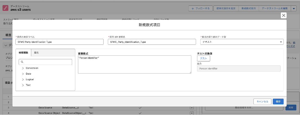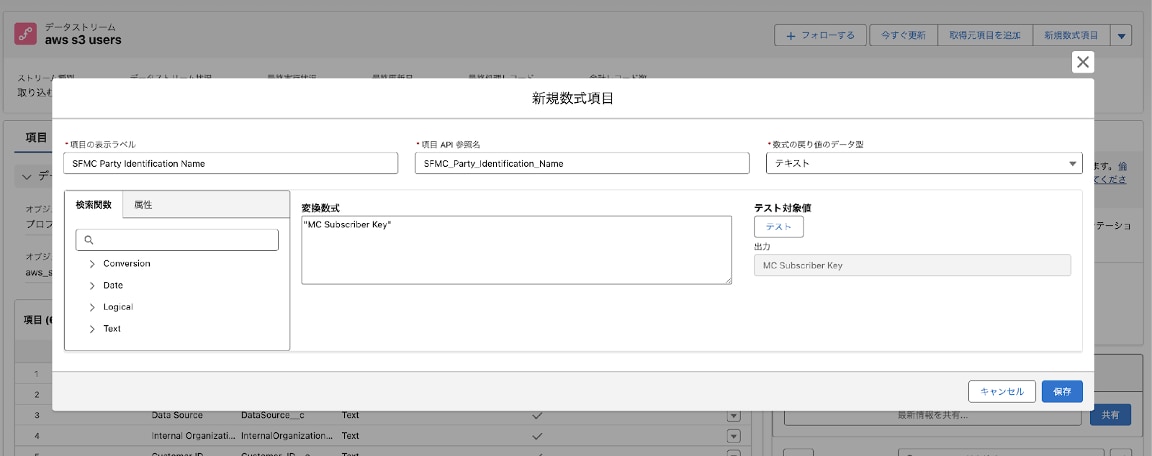 ※後から数式項目を追加した場合、データのフルリフレッシュをしないと過去のレコードに反映されないため、数式設定後に再度全件連携を行うorデータストリームの初期作成の時点で作成するようにしてください。