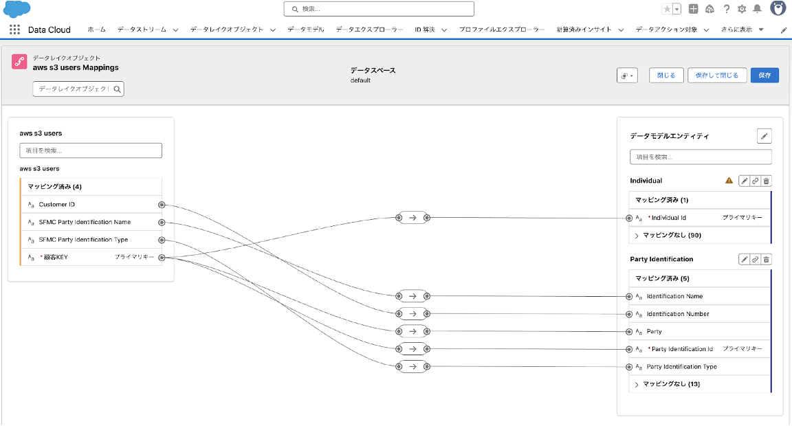 5-7. AWS S3の顧客データのデータストリームをデータモデル「Party Identification」にマッピングし「保存」をクリックします。
