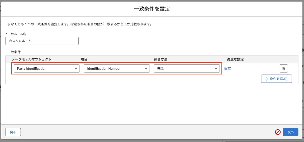 5-11. データモデルオブジェクトに「Party Identification」、項目に「Identification Number」、照合方法に「完全」を選択し、「設定」をクリックします。