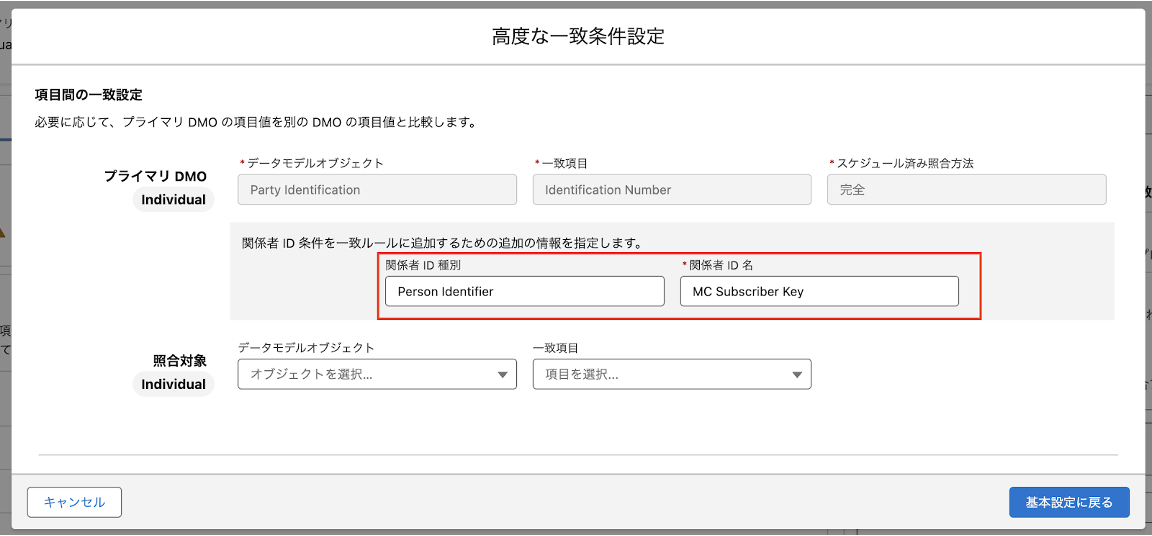 5-12. 関係者ID種別に「Person Identifier」、関係者ID名に「MC Subscriber Key」を入力し、「基本設定へ戻る」をクリックします。