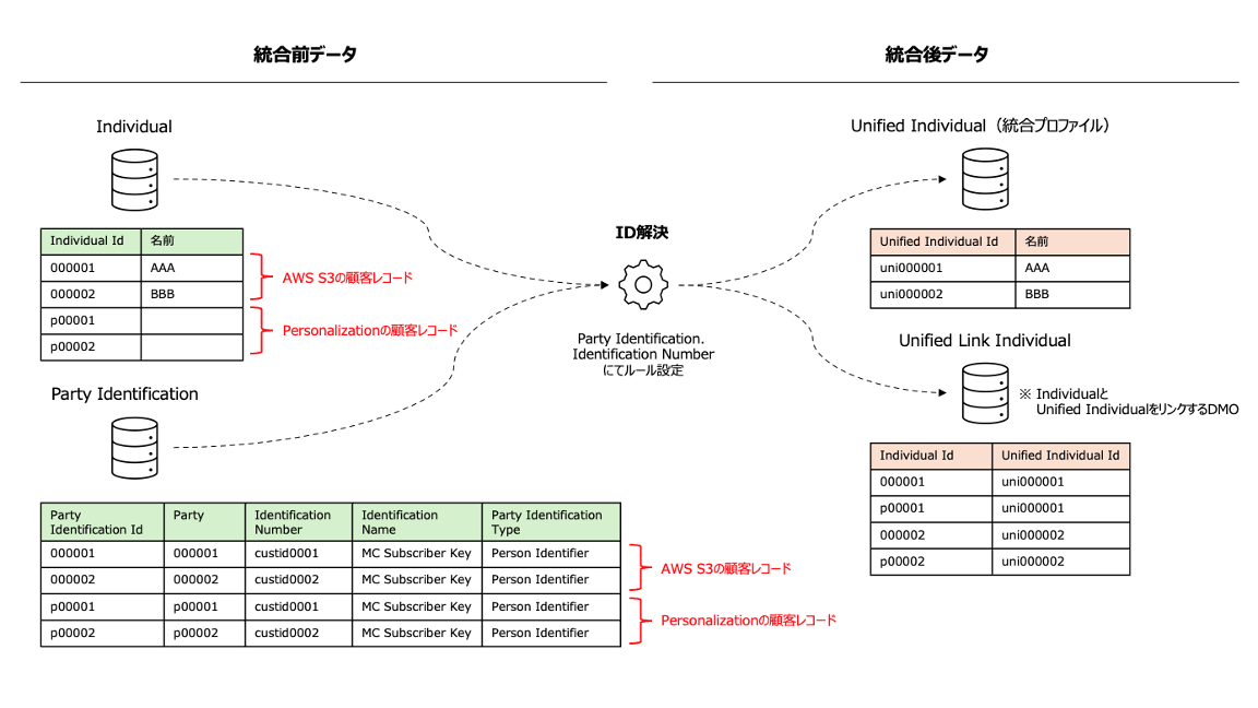 これを解決するには、AWS S3の顧客データとPersonalizationの顧客データをID解決で顧客統合を行い、統合プロファイルを作成する必要があります。