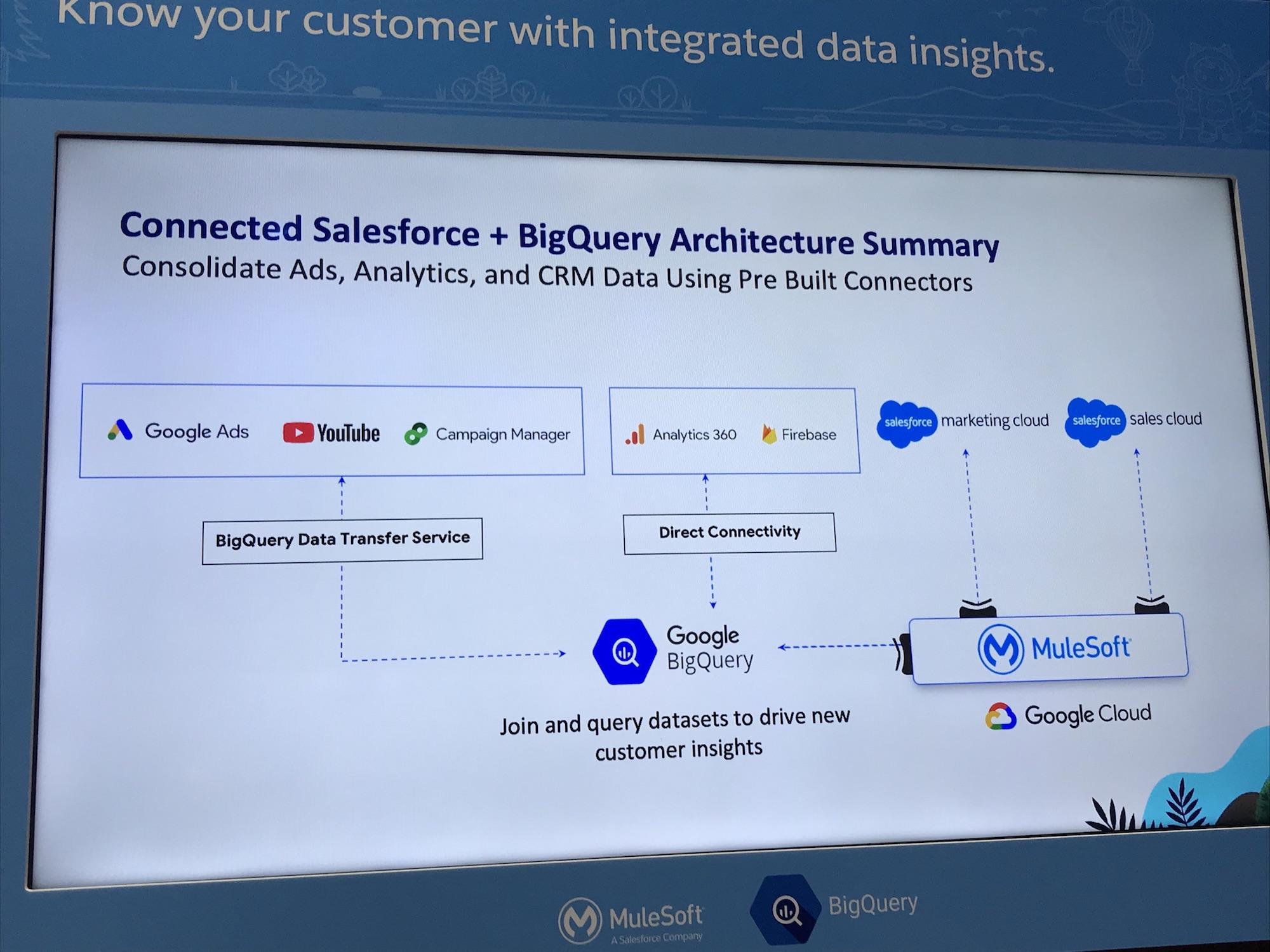 Mulesoftを活用することにより、Googleアナリティクス360のデータもSalesfoeceと連携が容易になり Cutomer360のMA領域の分析をより強固なものにするアーキテクチャーが提案されていました。