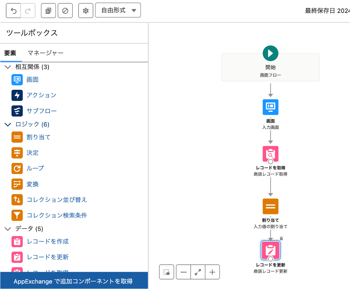 画面フローの特徴は、ユーザーとの対話形式で進行する点にあり、入力フォームやボタン、選択リストなどの画面要素を自由に配置可能です。